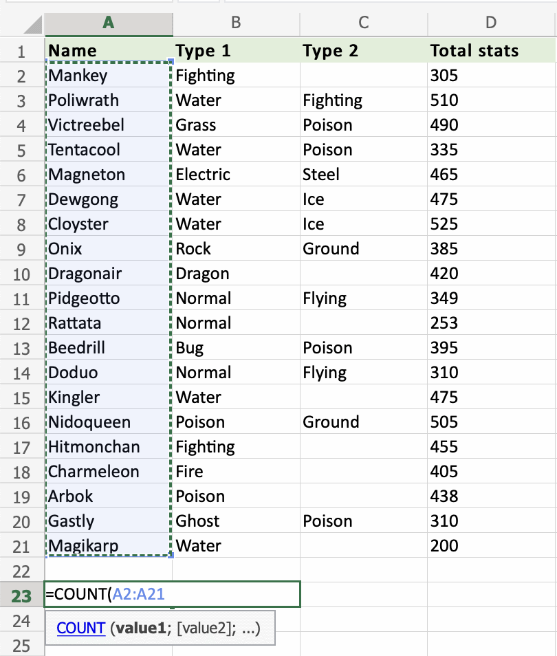 Apply the =COUNT function to range D2:D21. Counting the cells of Pokemon Total stats, which is numbers only: