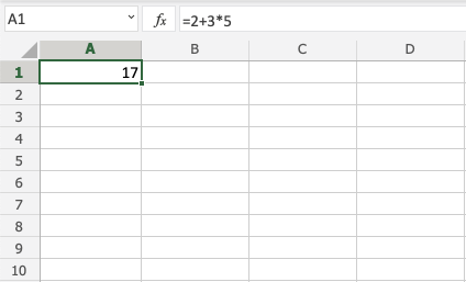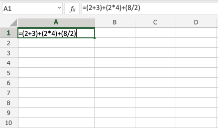 Note: Cells can be used as values in the formulas inside parentheses, like =(A1+A2)*B5. We have used manual entries in our examples to keep things simple.